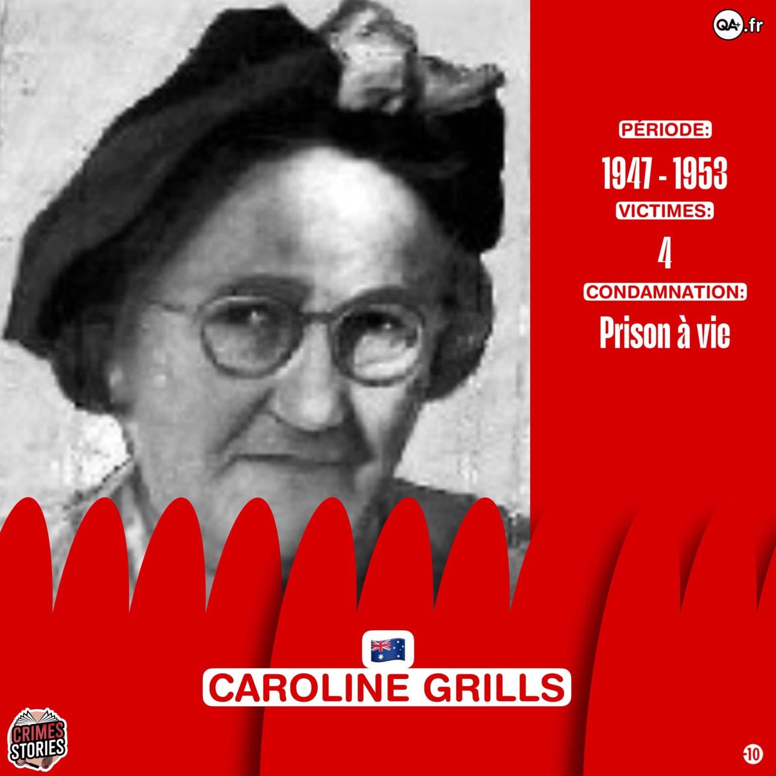 Grills, une femme de petite taille qui portait des verres noirs à monture épaisse, servait généralement du thé, des gâteaux et des biscuits à ses amis et à ses beaux-parents. Elle a comparu devant le tribunal pour quatre meurtres et trois tentatives de meurtre (la troisième étant Eveline Lundberg, de Redfern, la mère de Christine Downey) en octobre 1953. Elle a été condamnée le 15 octobre 1953 à mort, mais sa peine a ensuite été changée en prison à vie. Elle est devenue affectueusement connue sous le nom de « tante Thally » (une référence à « tante Sally ») à d’autres détenus de la prison de Long Bay à Sydney. En octobre 1960, elle a été transportée d’urgence à l’hôpital Prince Henry de Randwick où elle est décédée d’une rupture d’ulcère gastrique. Dans les mois qui ont suivi, d’autres cas d’empoisonnement au thallium ont été déclarés, y compris notamment l’éminent footballeur de la Ligue australienne de rugby Bobby Lulham.