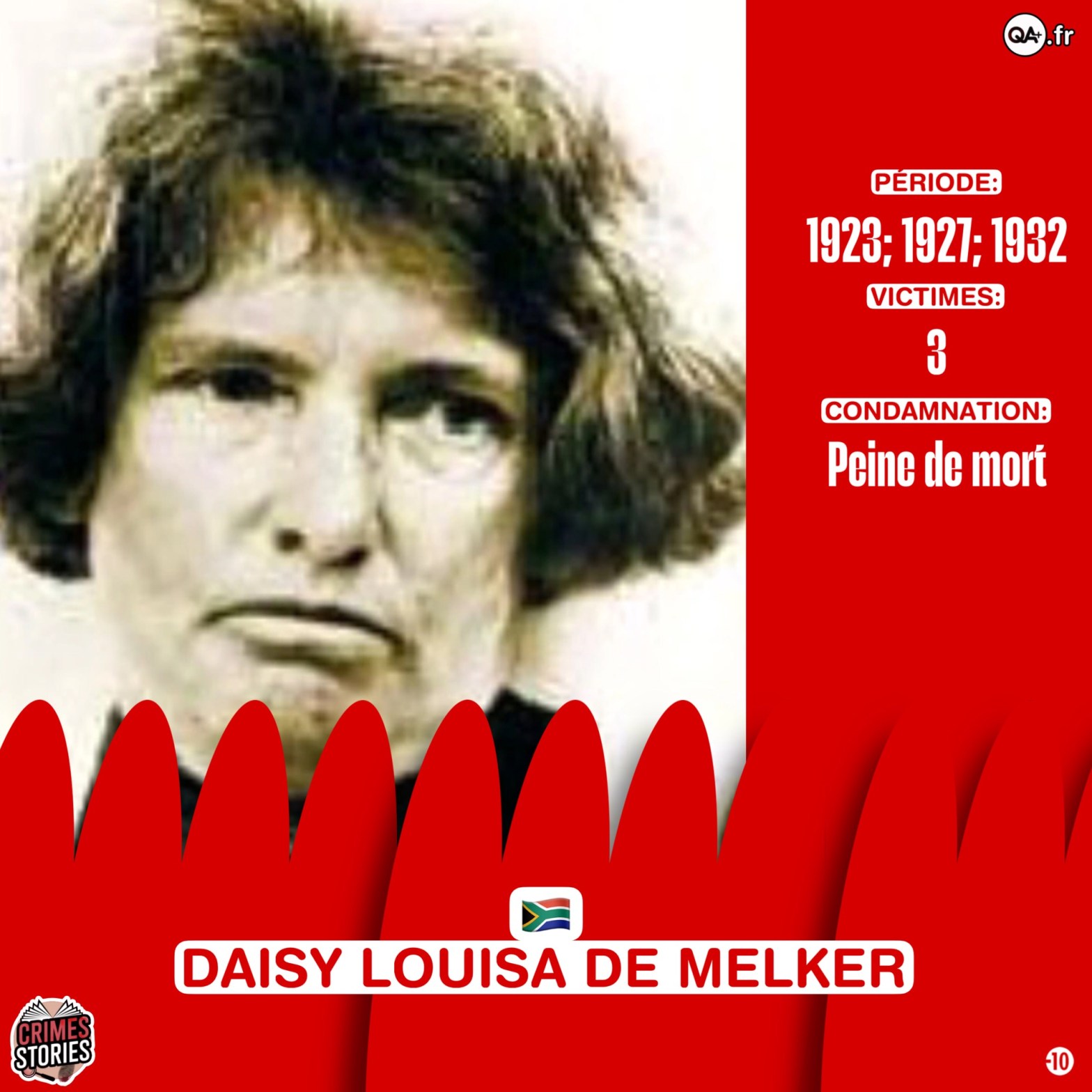 Daisy De Melker, âgée de 46 ans, fut condamnée à mort par pendaison, et exécutée le matin du 30 décembre 1932 à la prison centrale de Pretoria.